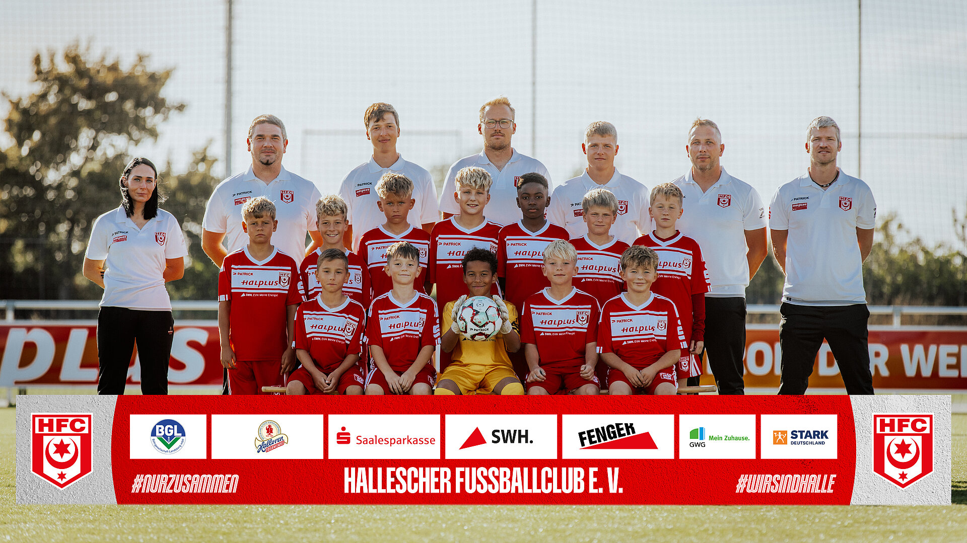 Dritte Reihe von links: Felix Krause (Leiter Nachwuchszentrum), Tobias Donath (Leiter Sport), Günther Golinski, Jonas-Joel Kaiser, Maurice Möbius, Emil Schmidt, Richard Nicolaus, Tim Jechorek (Torwarttrainer), Jonathan Ranft (Cheftrainer)