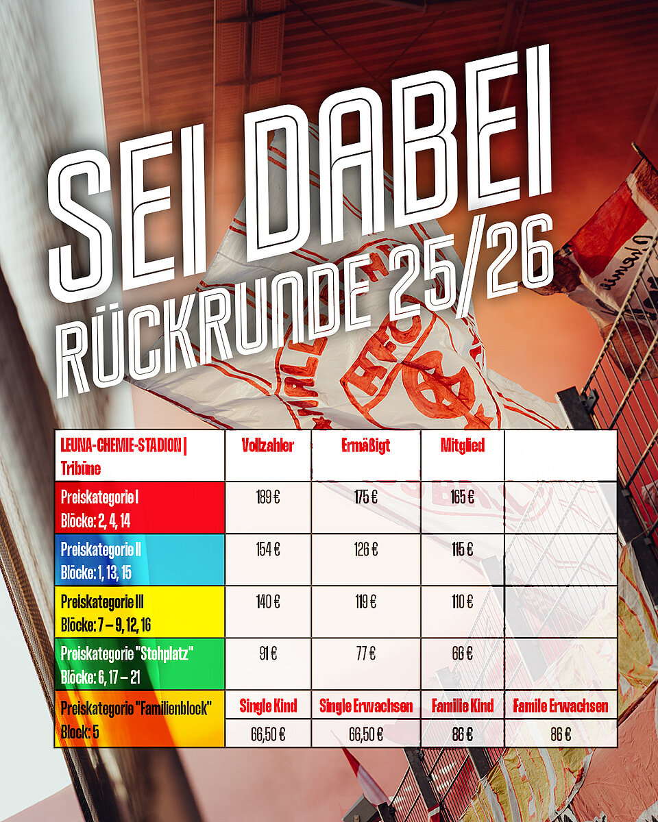 Die Rückrunde steht in den Startlöchern – und mit ihr die Chance, dir jetzt deinen festen Platz im LEUNA-CHEMIE-STADION zu sichern! Ob Topspiele gegen Jena, Erfurt, Chemnitz oder Zwickau: Mit der Rückrundendauerkarte bist du bei allen Highlights mittendrin.