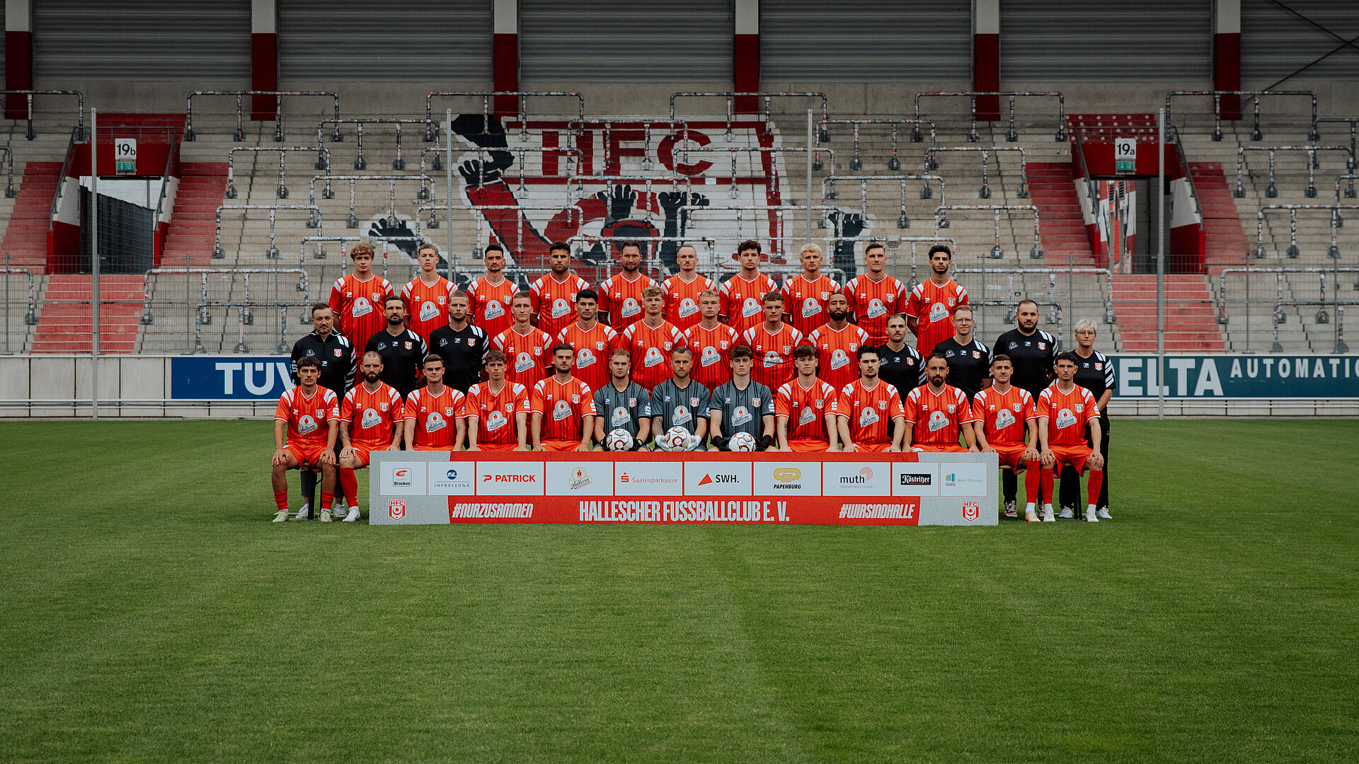 2. Reihe von links: Daniel Meyer (Sportdirektor), Sascha Prüfer (Co-Trainer), Robert Schröder (Cheftrainer) , Pascal Schmedemann, Burim Halili, Lucas Ehrlich, Kilian Zaruba, Vin Kastull, Cyrill Akono, Denis Hasenbek (Athletiktrainer & Physiotherapeut) , John Brandes (Sport- & Ernährungswissenschaftler) , Walter Moissejenko (Physiotherapeut) , Sandra Schultze (Technische Mitarbeiterin)
